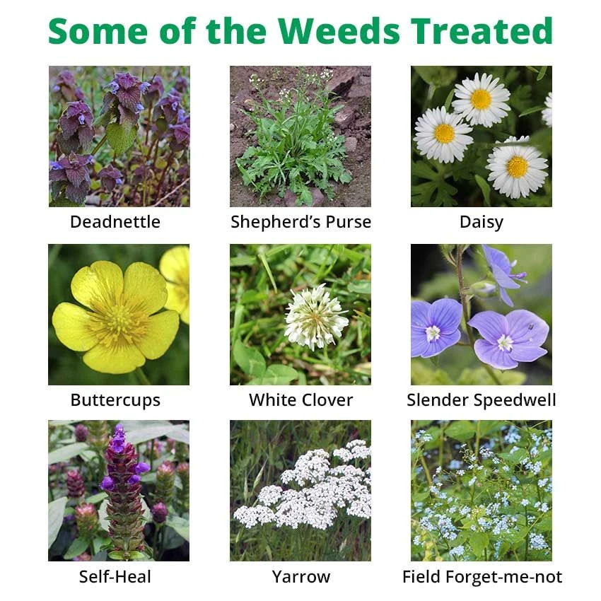 - Treats yarrow, buttercup, self-heal, daisy, white clover & dandelion